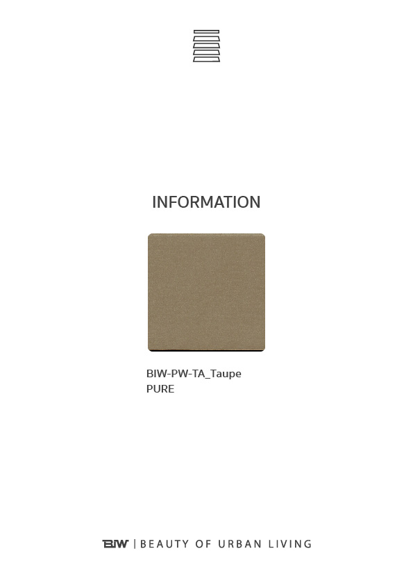 PURE WOOD BIW-PW-TA_Taupe PUREThese blinds create a real sense of character and a timeless atmosphere in any interior. TaupeBIW-PW-TAWoodLength 9 ftWidth 50 mmWeight 70 g/mThickness 2.6 mmLight fasness >5 ISO 105-B023,600 baht / sqm /