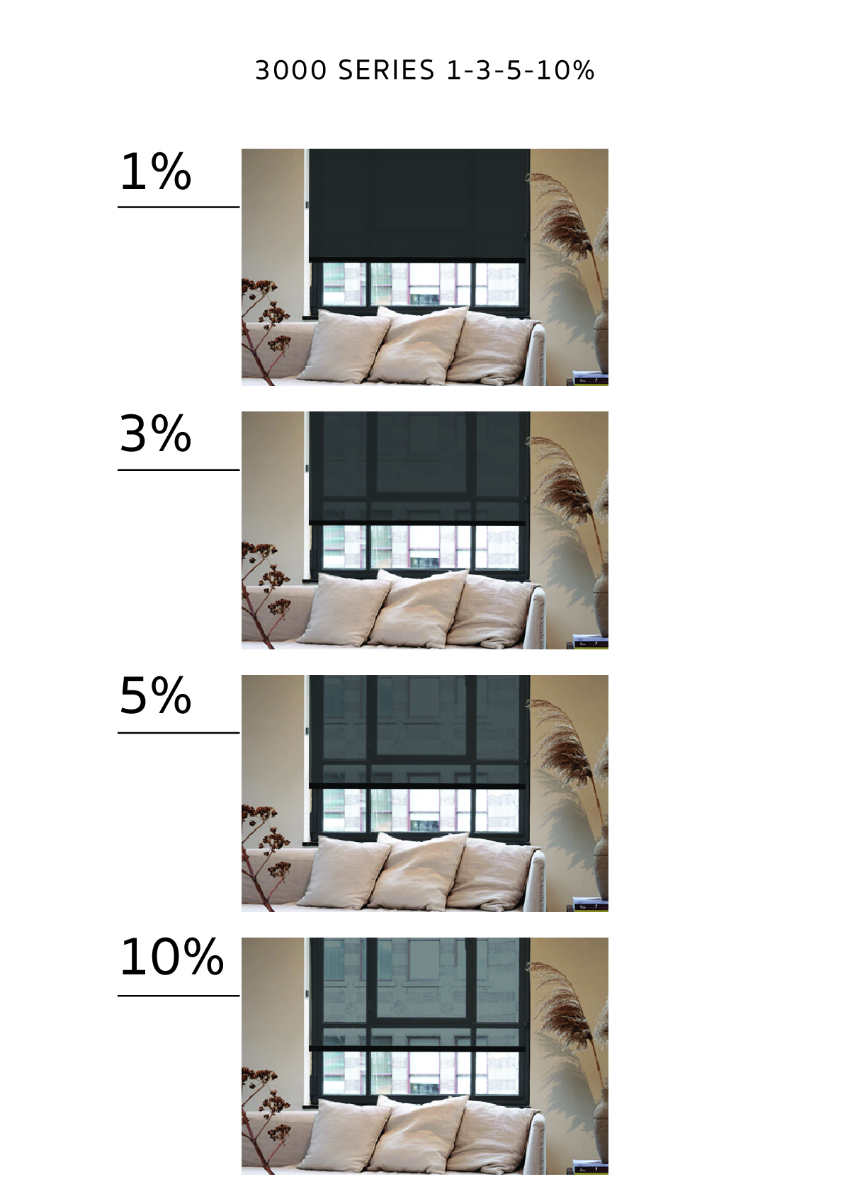 These polyester based fabrics have a tightly woven 1 x 1 basket construction and an open-ness factor of 1%. The fabric comes in 6 natural colors and is available in a width up to 3 meters.Thanks to its tightly woven structure, screen Essential 5001 provides privacy and noise reduction while preserving an adequate view outside.